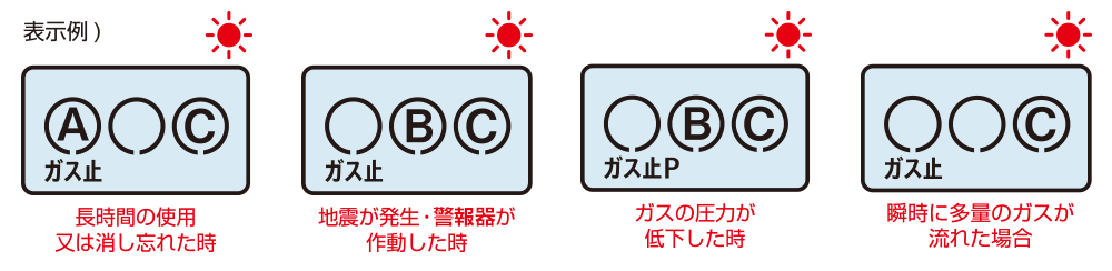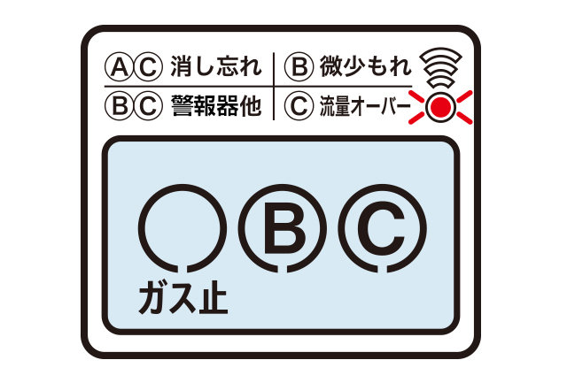 このとき液晶窓のアルファベットと「ガス止」の表示が出て、赤いランプが点滅していれば、ガスメーターが遮断しています。