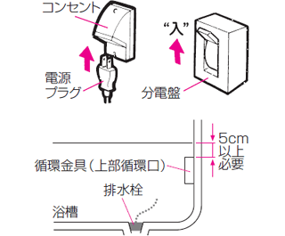 ・追だき機能付きふろがまは、浴槽の残り湯が循環金具上部より5cm以上、上にある状態にしておいてください。