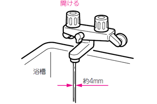 ・浴槽に排水栓をしてからおふろの給湯栓を開け、1分間に約400ミリリットル太さ約4mmの水を浴槽に流しておいてください。