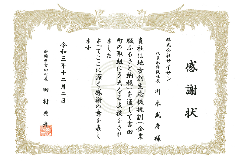 静岡県吉田町より感謝状を頂きました