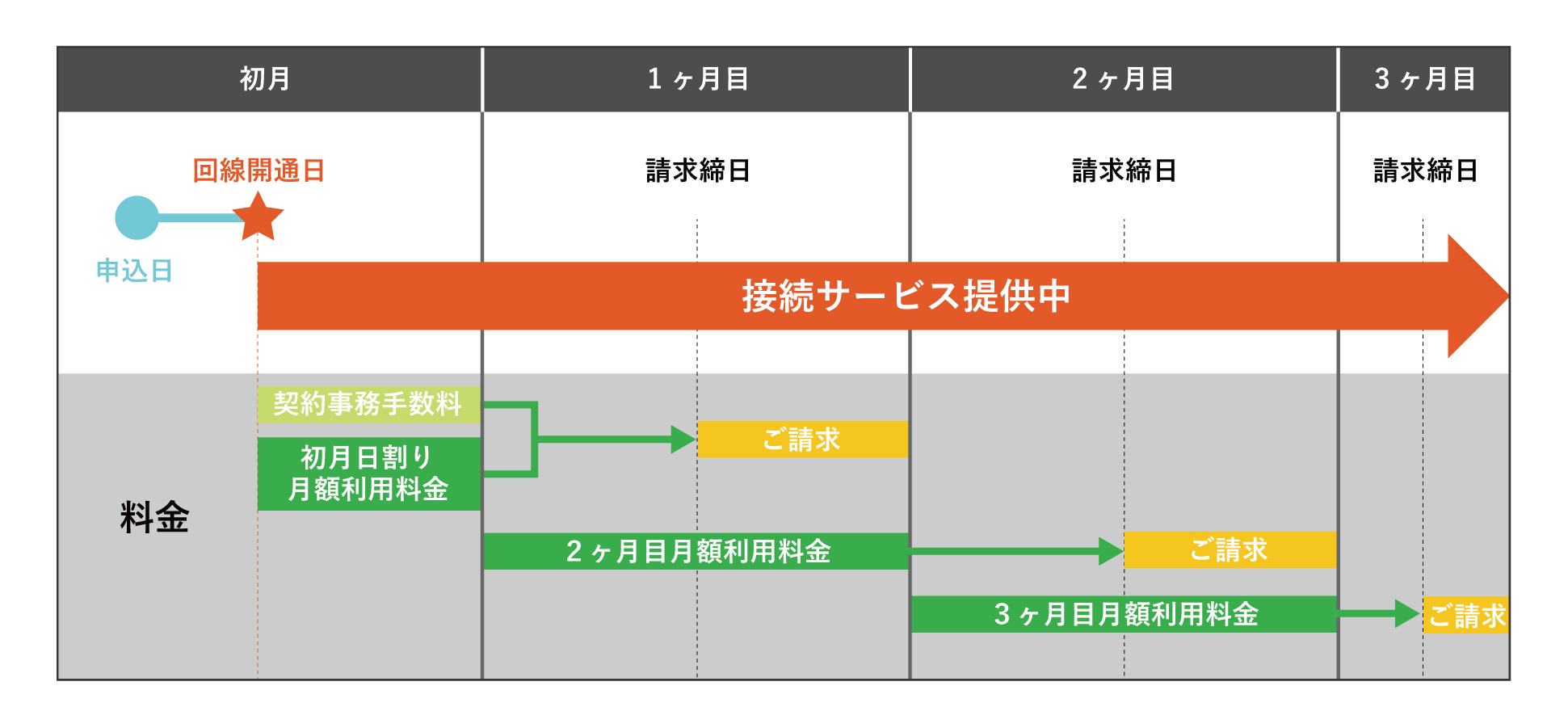 ・課金開始日が月末近くの場合、初月の利用料金(月額利用料金日割りおよび契約事務手数料)が、翌月の利用料金と合算して請求となる場合があります。