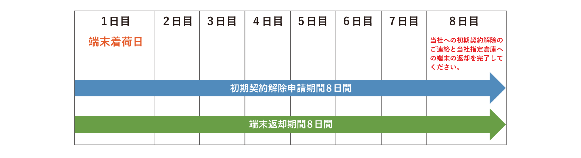 ・初期契約解除をされた場合、本契約により発生した事務手数料3,300円(税込)と契約月分のユニバーサルサービス料、電話リレーサービス料はご請求いたします。※基本料金(初月日割)、契約解除料1,100円(税込)と端末代金19,800円(税抜)は免除となります。