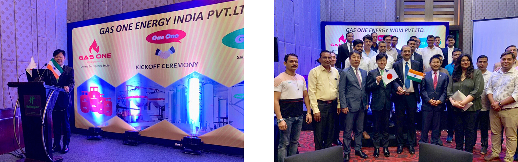 この度、インド側のパートナーであるランジット氏(Ranjit Choudhary)と合弁事業契約ならびに株式売買契約の締結をし、本年8月9日にインド最大の都市ムンバイにて、キックオフセレモニーを開催しました。当社にとって、GOEI社は9カ国10社目の海外グループ会社です。GOEI社はムンバイを中心に、産業用および業務用、一般家庭用の小売・卸売を主体に事業を展開しており、当社は、ガスワングループの多様な経営販売ノウハウを活用し、今後のさらなる業容拡大に努めてまいります。また、環境に優しい分散型エネルギーであるLPガスの安定供給に寄与すると共に、インドの益々の経済・社会の発展、環境保全と技術革新にも貢献していく所存です。