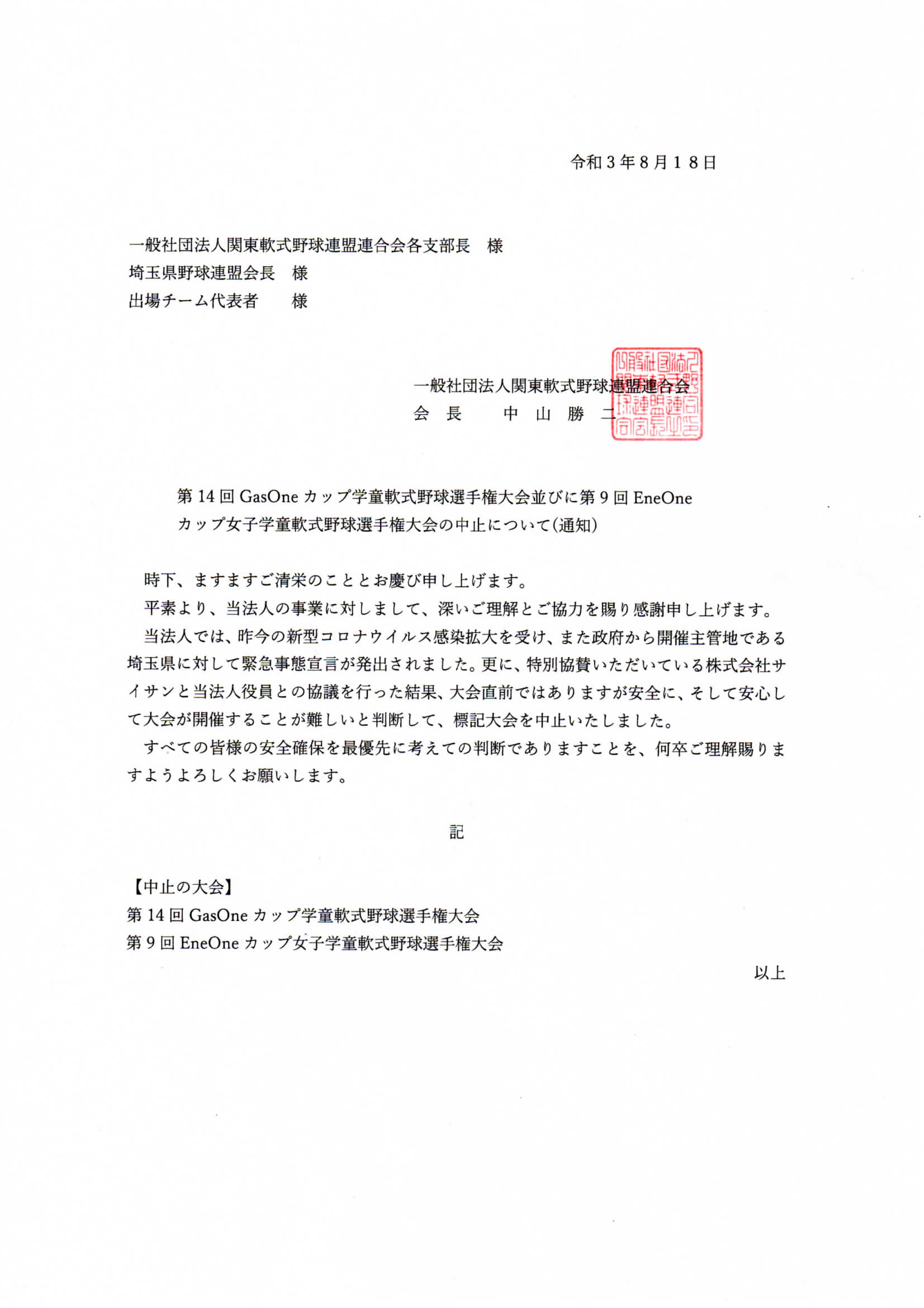 中止に至る経緯といたしまして、開催地である埼玉県に緊急事態宣言が発出されていることや、現在も新型コロナウィルスが猛威を振るっており、参加児童や大会関係者の健康管理を十分に確保することが困難であるとの判断から、大会主催の一般社団法人関東軟式野球連盟連合会と協議の結果、止む無く開催中止を決定いたしました。