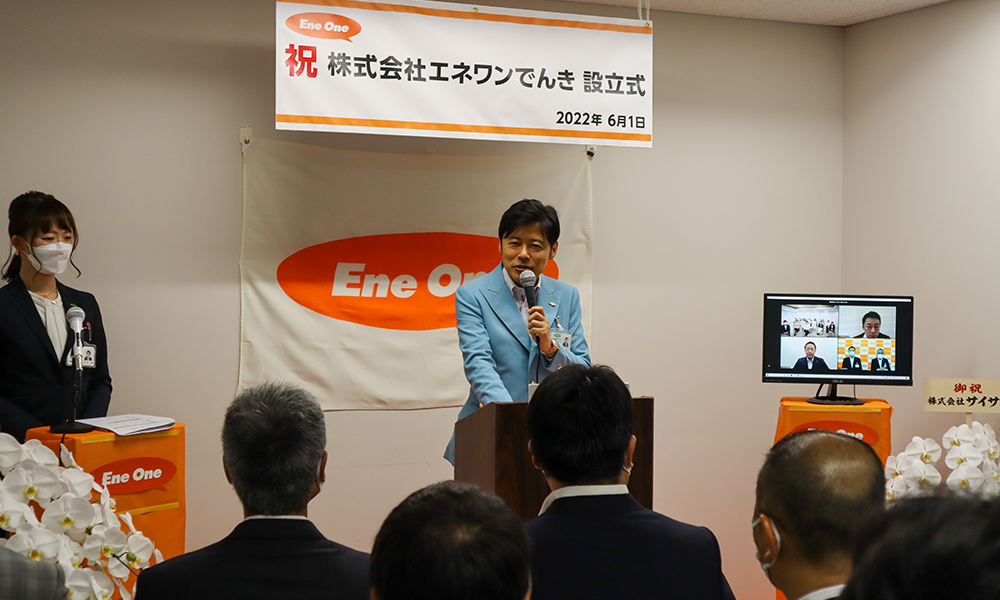 設立式では、サイサン川本武彦社長と中電ミライズ鈴木秀和部長から挨拶があり、エネワンでんき設立を祝しました。