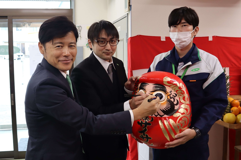 【写真4】ダルマの目入れ(左から)川本社長、鹿内所長