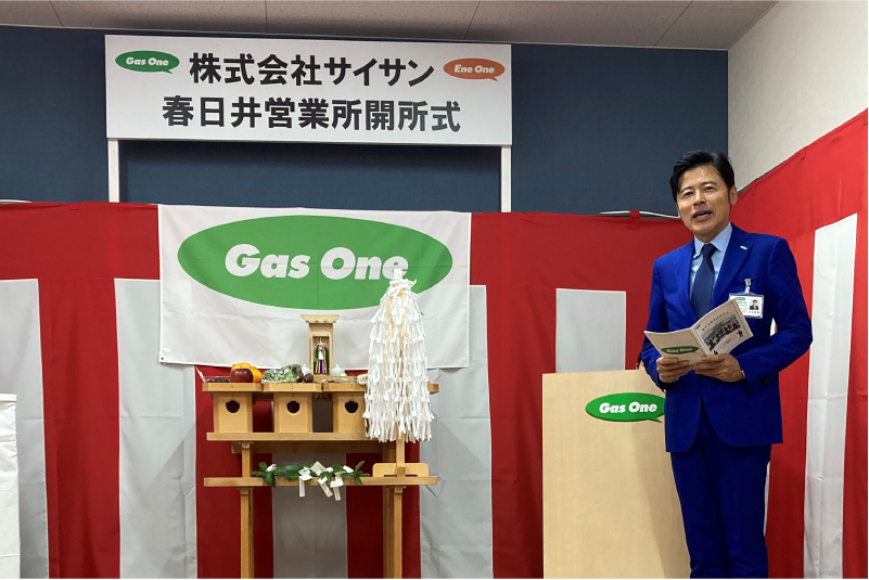 川本社長の挨拶では、「営業所発展のためには自分がこの組織で何が出来るかを常に考えて動くことが必要であり、所員皆で切磋琢磨し、それぞれの良い所を出して成長して欲しい。当社は、アジア太平洋地域で9か国にまで事業展開し、2045年創業100周年にはアジア太平洋地域のエネルギー小売事業でリーディング企業になるという大きなビジョンを持っている。まずはこの春日井の地で、次に愛知の地で地域一番店となり、このビジョンの達成を所員皆と一緒に目指していきたい。春日井営業所の発展を心より祈念している。」と、述べました。