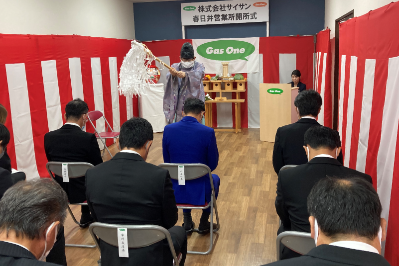 開所式では、神事の後、当社執行役員中部支店支店長の市川剛史より開式挨拶、代表取締役社長 川本武彦からの挨拶と続き、来賓である株式会社オンテック 関連事業本部部長 間瀬浩 様からご祝辞を頂戴しました。最後に当社春日井営業所所長 中井一郎より新任の挨拶で閉式となりました。