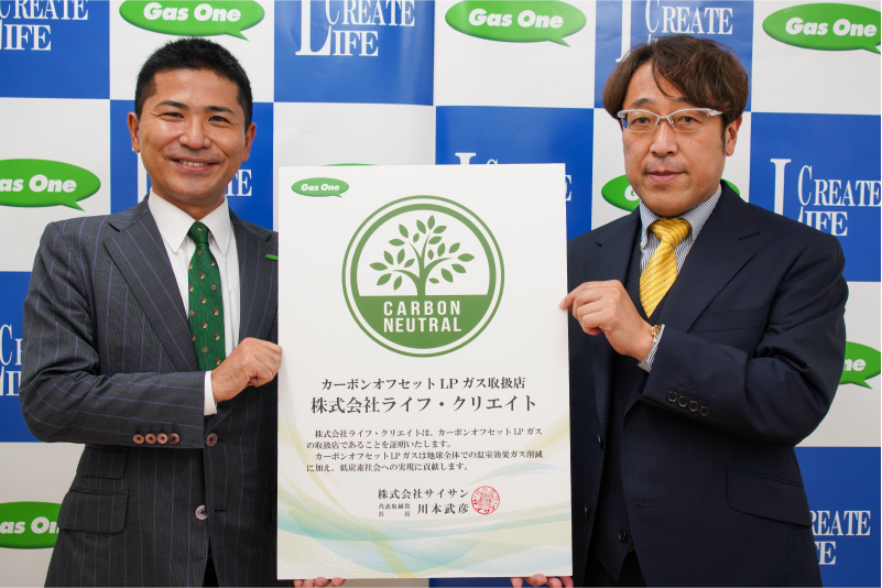 この証明書交付により、ライフ・クリエイトが自社管理している賃貸住宅において、LPガス使用時に排出される二酸化炭素(以下CO2)を実質ゼロにするカーボンオフセットLPガスの取扱いが可能となります。