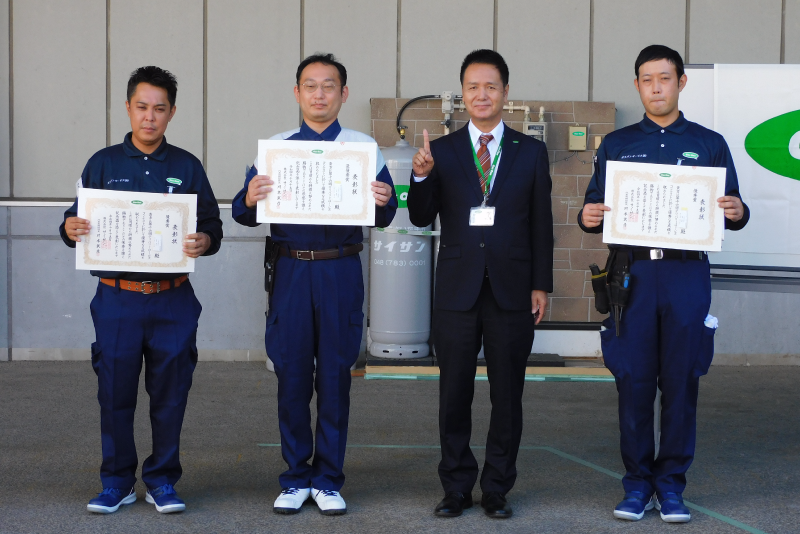 コンテストには、サイサンの7支店、グループ会社、協力会社の容器配送担当者約250名の中から選抜された8名が出場し、最優秀賞を株式会社いちたかガスワン 一橋和樹選手、優秀賞をガスワンサービス株式会社上尾営業所 松本悠佑選手と同土浦営業所 箱守竜也選手の2名が受賞しました。