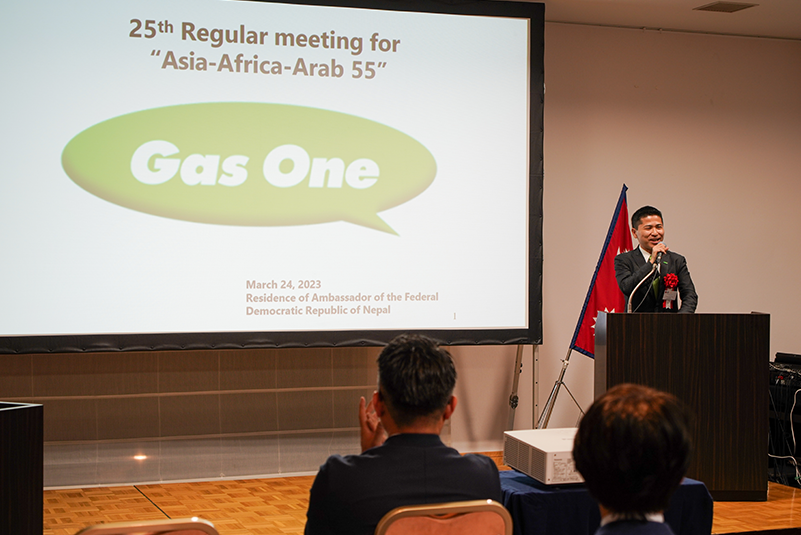 2023年3月24日、在日本ネパール大使公邸にて「アジア・アフリカ・アラブ55 第25回定例会」(主催:一般社団法人アジア・アフリカ・アラブ55:以下、同法人)が開催され、株式会社サイサン(さいたま市大宮区 代表取締役社長 川本武彦:以下、弊社)代表取締役副社長 川本知彦が事業プレゼンテーションを行いました。