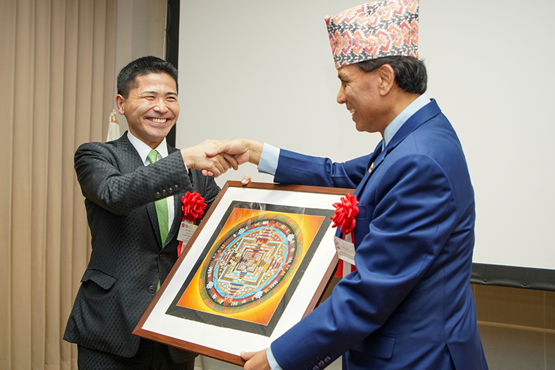 【写真3】弊社副社長川本知彦へ記念品を贈呈するネパール国特命全権大使ドゥルガ・バハドゥール・スベディ閣下(右)