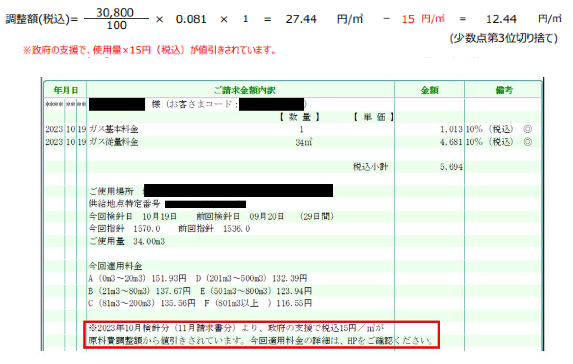 参考)東京ガスエリア10月検針分 原料費調整額計算式 及び 請求書例