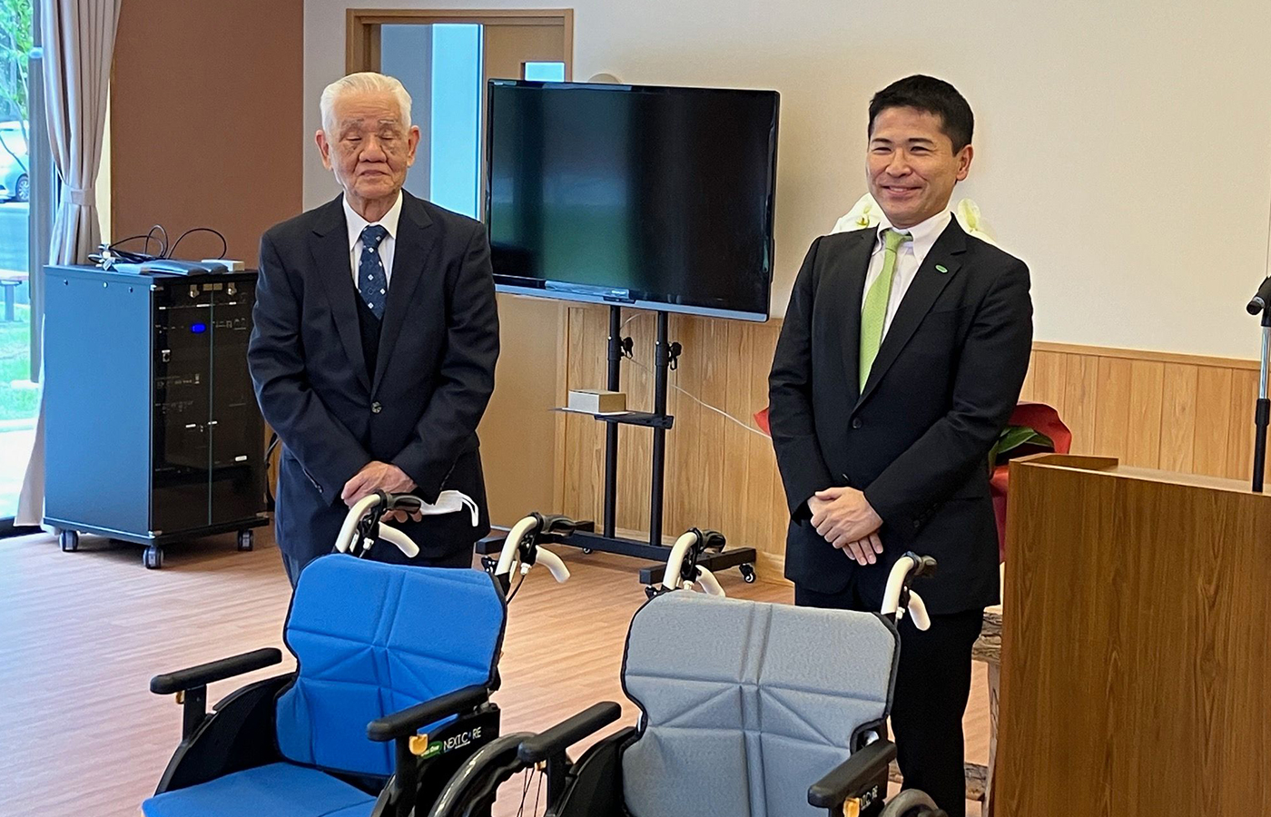 同日、社会福祉法人すかいが運営する障害者支援施設 皇海荘(すかいそう)にて「車いす贈呈式」を執り行い、鬼怒川ガス代表取締役社長の川本知彦は、「常日頃の社会福祉法人すかい様の社会福祉への取り組みについて、神内理事長はじめ職員の皆さまへ、その崇高な理念に心から敬意を表する次第であり、今回の贈呈につきまして迷わず選定させていただきました。さらなる地域福祉向上のために、お役立ていただければ幸いです。」と述べました。