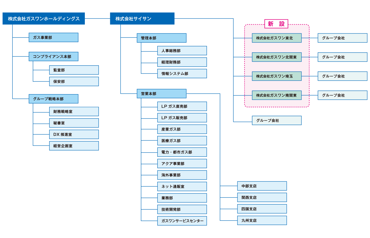 この度、株式会社サイサン(さいたま市大宮区 代表取締役社長 川本武彦:以下、弊社)を基幹とするGas One(ガスワン)グループは、2024年9月1日付で株式会社ガスワンホールディングス*(以下、ガスワンHD)を持株会社としたホールディングス体制に伴い、組織再編を実施いたします。