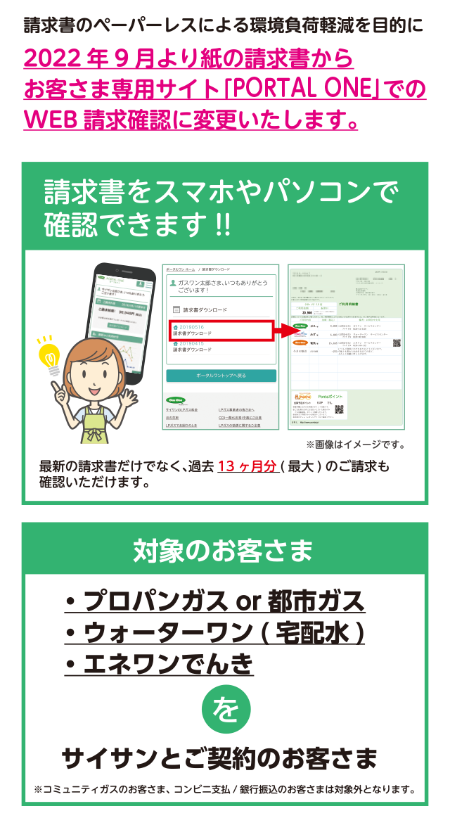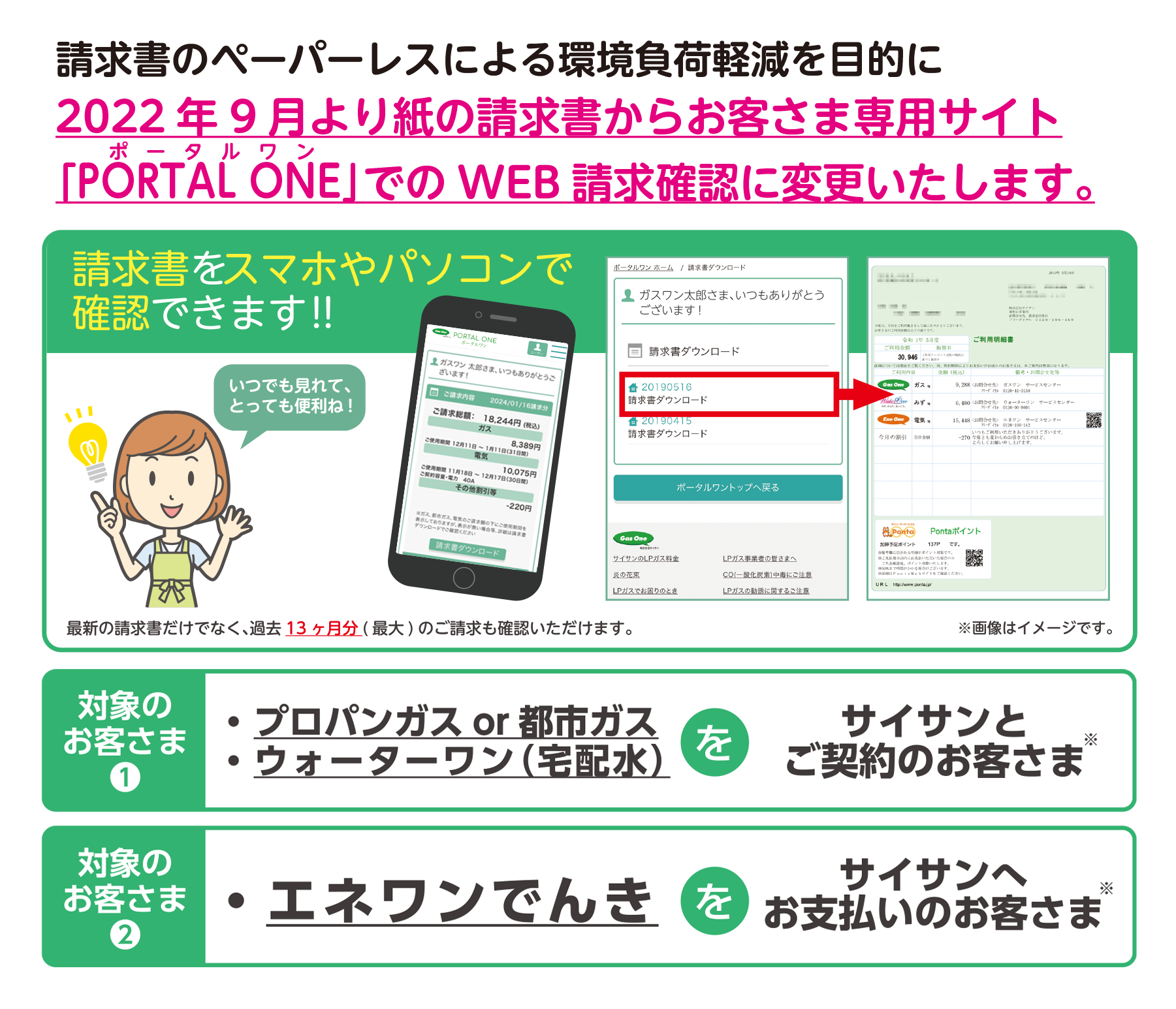※請求書ペーパーレス化に伴う電気・都市ガスの約款変更について順次お客さまへご案内をお送りしておりますが、既にポータルワンへご登録済のお客さまにつきましては改めてお手続きいただく必要はございません。