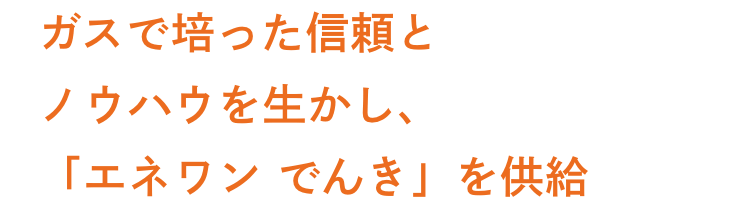 日本では電力の自由化に伴い、お客さま自身のライフスタイルに合わせて好きな会社を選べる時代となりました。その中で、当社は2005年高圧電力(法人向け)の自由化に伴い、オフィスビルや学校等1,000件以上の施設に供給し、2016年低圧電力(一般家庭向け)の自由化でも現在ガスをご利用いただいているお客さまや、新たなお客様に“電気のパートナー”としても選んでいただいております。更に、環境問題解決へも積極的に取り組み、再生可能エネルギーやカーボンニュートラルでんきにも注力しています。現在、世界ではエネルギーコストや脱炭素問題など数多くの問題を抱えております。Gas Oneグループとしてこれらの問題に立ち向かうため、エネルギー事業部を分社化し、2022年に株式会社エネワンでんきを設立致しました。
