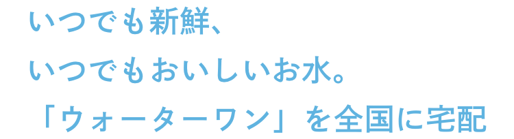 2007年にスタートした「ウォーターワン」は厳選された天然水を、本来のおいしさのままボトリングして、採水地から直接ご自宅にお届けするサービスです。バナジウムやミネラル成分を含む富士山麓の水、名水百選に挙げられた南阿蘇湧水群の水、島根の手つかずの自然が育むアルカリイオン水、そして久米島の豊かな海から汲み上げた海洋深層水。これら4つの天然水を安全にお届けするために品質管理を徹底し、サービスを向上させるとともに、個人のお客さま、法人様、取次店様とのご契約を拡大し、より多くのお客さまにご利用いただけるよう努めています。