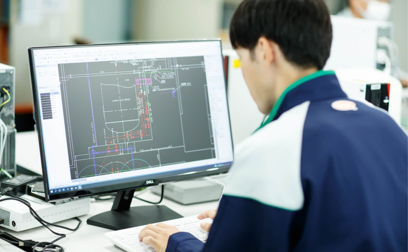 私が所属している技術開発部は、お客さまにガスを使っていただくための設備の設計・施工、既存設備の維持管理・保守に携わる部署です。まずはお客さまとの打合せでニーズを伺いますが、扱う設備はボイラー、乾燥機、オーブン、実験装置など多岐にわたり、それぞれに使用するガスの種類や圧力が異なるので、用途に合わせた設計(流量計算、圧力損失計算)が必要になります。また、CADという図面ソフトを利用して設備図面を描き、設計と合わせて工事にかかる費用の積算を行います。工事が決定したら、実際に施工業者と協力して設備工事に取り掛かり、完了後は試運転調整やお客さまへのご説明を経て、設備をお渡しします。このように、打合せ、設計、積算、施工、引き渡しが一連の流れとなり、最後に完成図書(図面や仕様書、検査成績書をまとめた書類)を作成して完成となります。