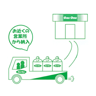 LPガスの国家資格を持った専門スタッフが、ガスワンマークの入ったガスワングループの専有車で納品を行います。