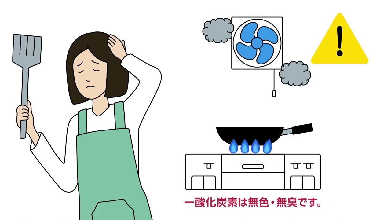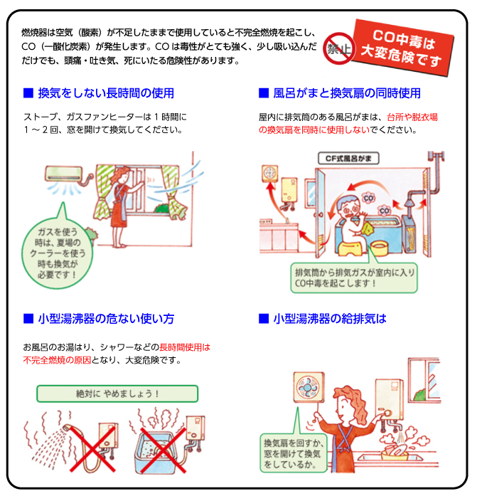 空気(酸素)が不足した状態でガスを燃やすと発生する為、「換気をして新鮮な空気を取込むこと」が事故を未然に防ぐ為の最も有効な手段です。