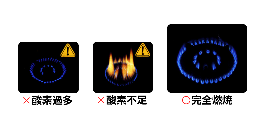 ● ガスをお使いのときは、必ず「青い炎」でお使いください。赤っぽい炎は不完全燃焼をしている炎です。