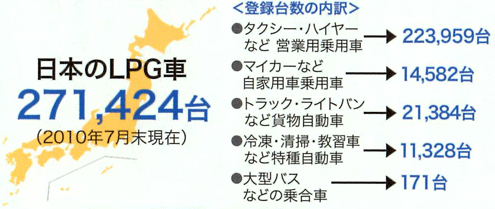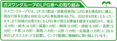 家庭用のプロパンガスとして使われるLPガスを燃料として走る自動車です。燃料供給装置がLPガス専用のものに変更されています。