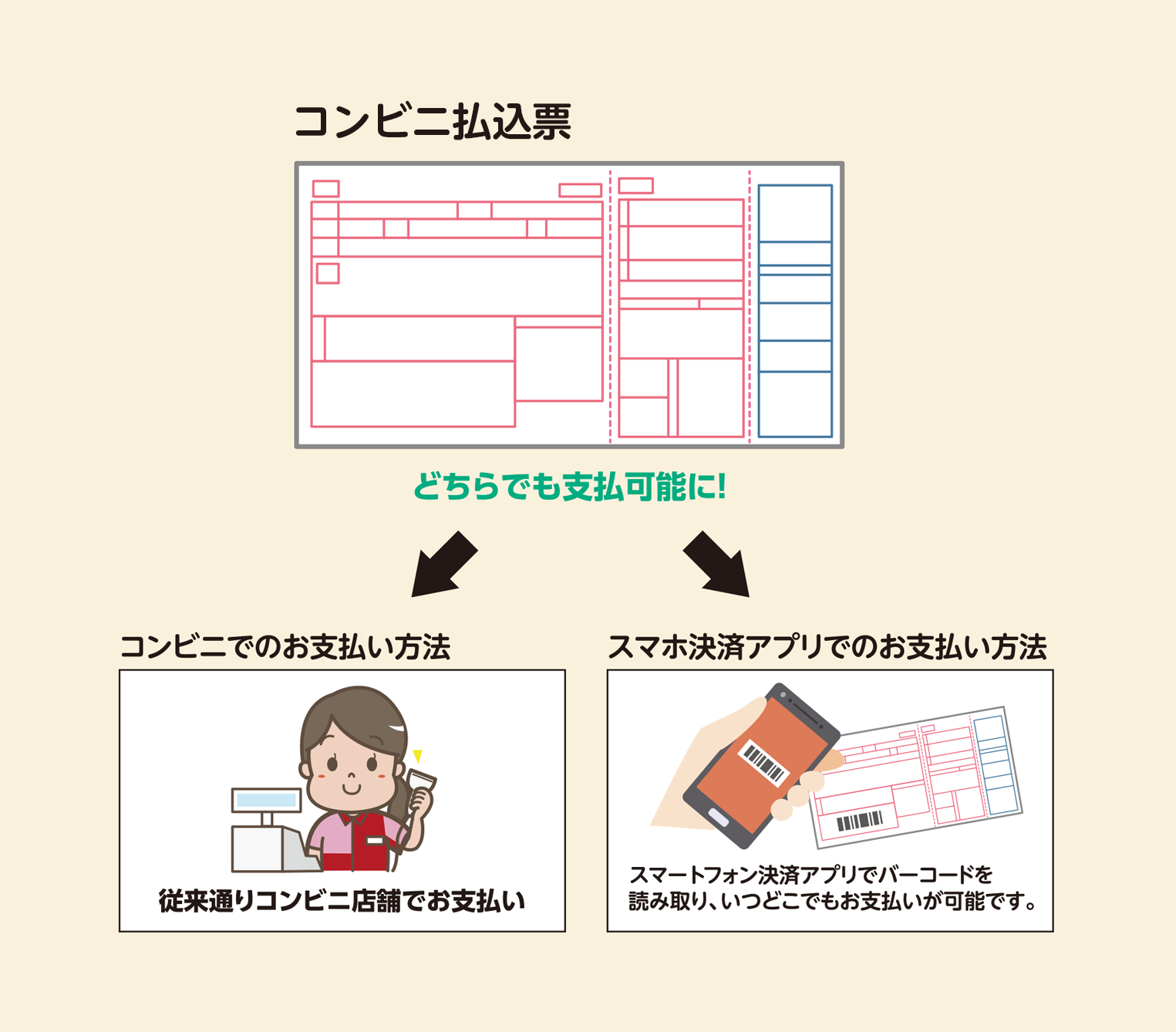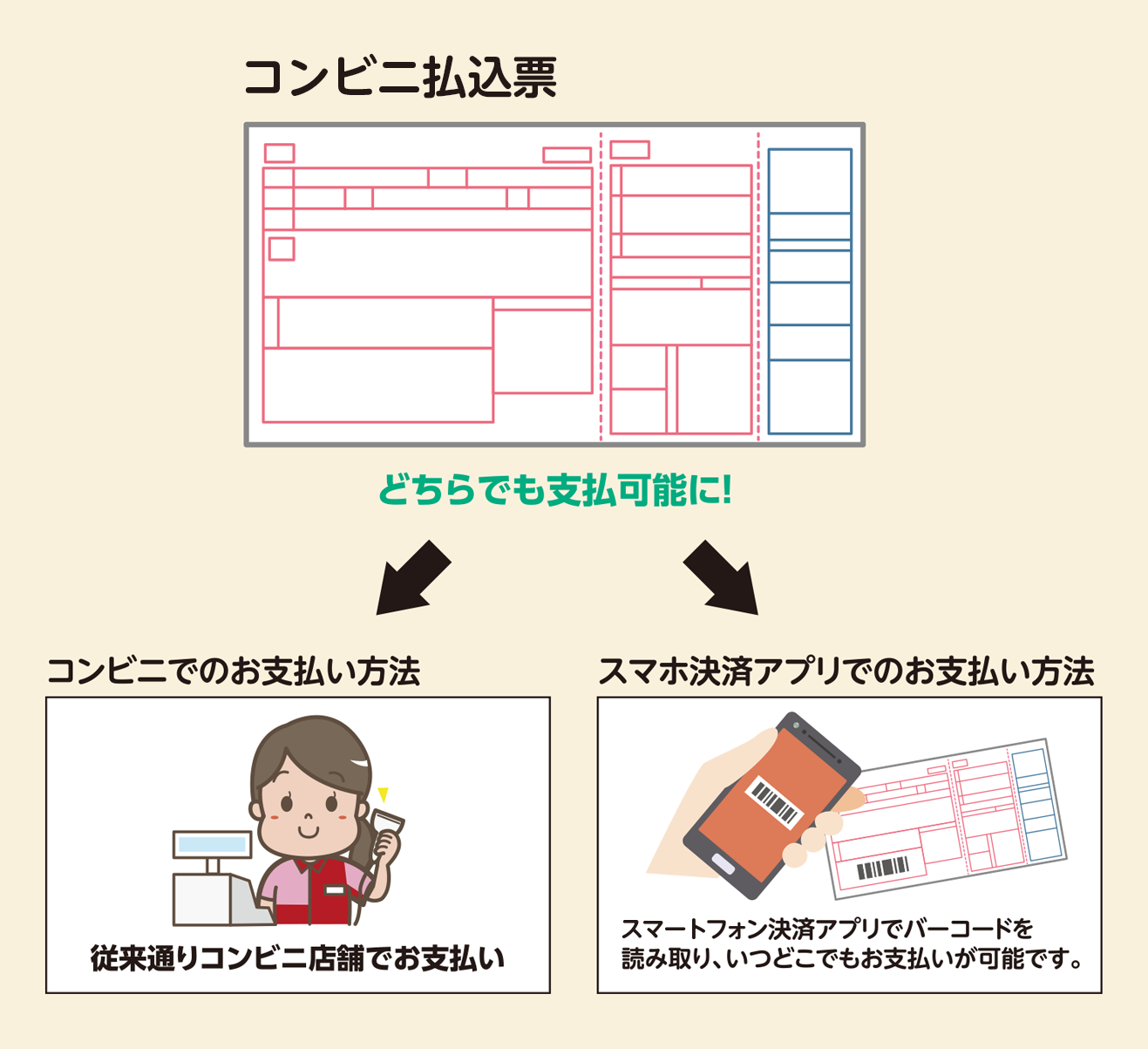 スマートフォン決済アプリでコンビニ払込票にあるバーコードを読み込むことで、お客様のご利用料金をお支払いいただくことが可能です。