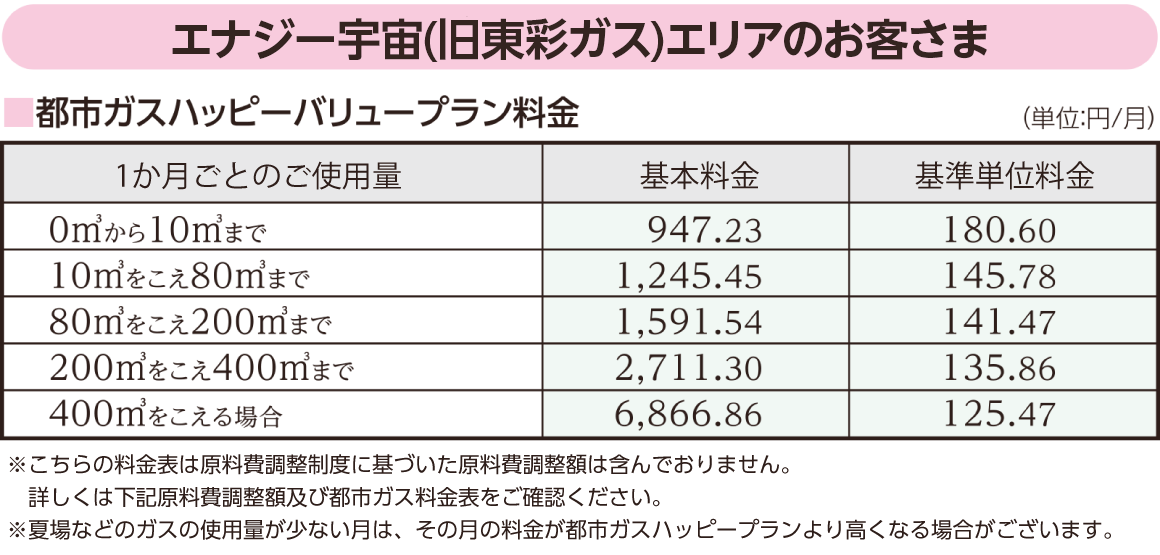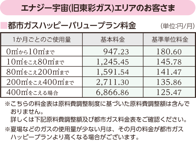 【エナジー宇宙(旧東彩ガス)エリア】都市ガスハッピーバリュープラン料金表 【エナジー宇宙(旧東彩ガス)エリア】原料費調整額及び都市ガス料金表