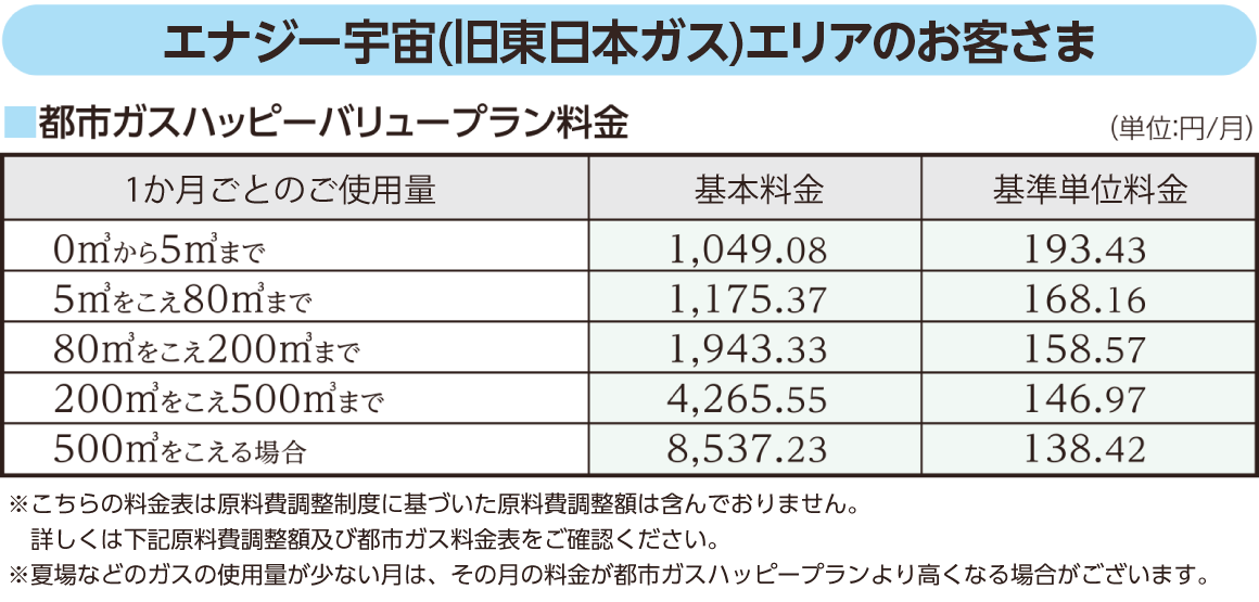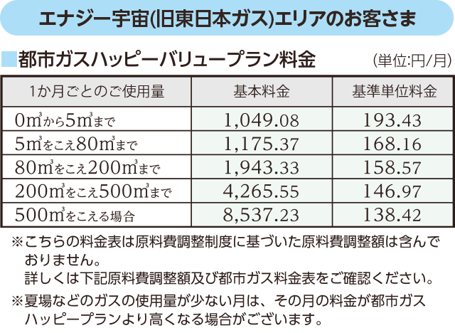 【エナジー宇宙(旧東日本ガス)エリア】都市ガスハッピーバリュープラン料金表 【エナジー宇宙(旧東日本ガス)エリア】原料費調整額及び都市ガス料金表