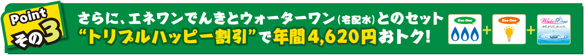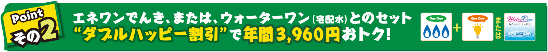 ●東京ガスの一般料金、都市ガスハッピープランともに、消費税等を含み、原料費調整制度に基づいた原料費調整額は含みません。●東京ガスの料金は、一般ガス供給約款(2019年10月1日実施)に基づき、算出したものです。詳しくは東京ガスのホームページ等でご確認ください。●年間メリット額は、上記の条件により算出したメリット額を年間換算(12倍)したものです。実際のメリット額はガスのご使用状況や、ご契約の時期、原料費調整額等により変動します。●ダブルハッピー割引は、株式会社サイサンが販売する「都市ガスハッピープラン」と宅配水「ウォーターワン」または株式会社エネワンでんきが販売する家庭用電力「エネワンでんき」のいずれか2つの商品をご契約の場合、且つ、おまとめ請求されている場合、毎月のご請求金額より「セット割引」として月額330円(税込)を割引いたします。すでに「ウォーターワン」または「エネワンでんき」をご契約いただいているお客さまが「都市ガスハッピープラン」をご契約いただいた場合も適用となります。●トリプルハッピー割引は、株式会社サイサンが販売する「都市ガスハッピープラン」と「ウォーターワン」および株式会社エネワンでんきが販売する「エネワンでんき」の3つの商品をご契約の場合、且つ、おまとめ請求されている場合、毎月のご請求金額より「セット割引」として月額385円(税込)を割引いたします。すでに「ウォーターワン」および「エネワンでんき」をご契約いただいているお客さまが都市ガスハッピープランをご契約いただいた場合も適用となります。●各セット割引は、ご家庭でご利用の個人のお客さまのみ対象となります。●セット割引対象商品のご請求がない場合、セット割引は適用されません。●価格は特段記載のない限り税込(消費税10%)表示です。