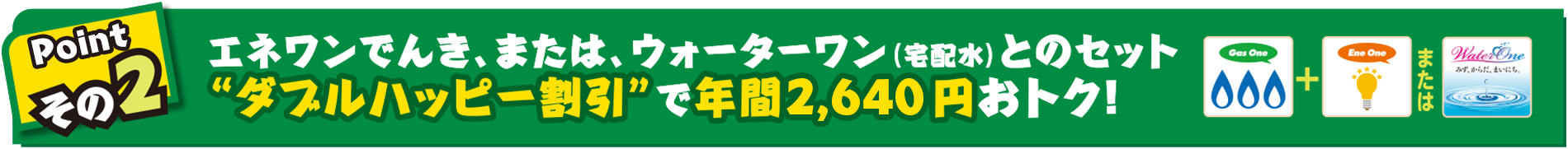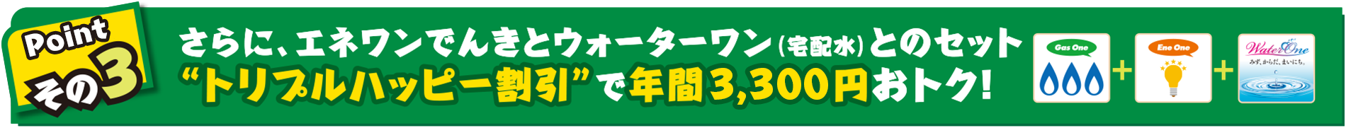 ●大阪ガスの一般料金、都市ガスハッピープランともに、消費税等を含み、原料費調整制度に基づいた原料費調整額は含みません。●大阪ガスの料金は、一般ガス供給約款(2020年5月11日実施)に基づき、算出したものです。詳しくは大阪ガスのホームページ等でご確認ください。●年間メリット額は、上記の条件により算出したメリット額を年間換算(12倍)したものです。実際のメリット額はガスのご使用状況や、ご契約の時期、原料費調整額等により変動します。●ダブルハッピー割引は、株式会社サイサンが販売する「都市ガスハッピープラン」と宅配水「ウォーターワン」または株式会社エネワンでんきが販売する家庭用電力「エネワンでんき」のいずれか2つの商品をご契約の場合、且つ、おまとめ請求されている場合、毎月のご請求金額より「セット割引」として月額220円(税込)を割引いたします。すでに「ウォーターワン」または「エネワンでんき」をご契約いただいているお客さまが「都市ガスハッピープラン」をご契約いただいた場合も適用となります。●トリプルハッピー割引は、株式会社サイサンが販売する「都市ガスハッピープラン」と「ウォーターワン」および株式会社エネワンでんきが販売する「エネワンでんき」の3つの商品をご契約の場合、且つ、おまとめ請求されている場合、毎月のご請求金額より「セット割引」として月額275円(税込)を割引いたします。すでに「ウォーターワン」および「エネワンでんき」をご契約いただいているお客さまが都市ガスハッピープランをご契約いただいた場合も適用となります。●各セット割引は、ご家庭でご利用の個人のお客さまのみ対象となります。●セット割引対象商品のご請求がない場合、セット割引は適用されません。●価格は特段記載のない限り税込(消費税10%)表示です。