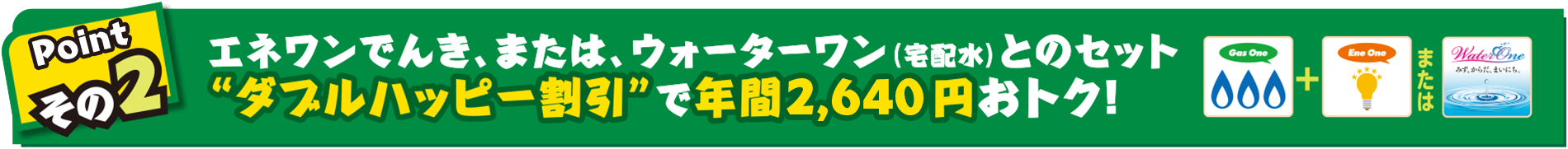 ●東邦ガスの一般料金、都市ガスハッピープランともに、消費税等を含み、原料費調整制度に基づいた原料費調整額は含みません。●東邦ガスの料金は、一般ガス供給約款(2019年10月1日実施)に基づき、算出したものです。詳しくは東邦ガスのホームページ等でご確認ください。●年間メリット額は、上記の条件により算出したメリット額を年間換算(12倍)したものです。実際のメリット額はガスのご使用状況や、ご契約の時期、原料費調整額等により変動します。●ダブルハッピー割引は、株式会社サイサンが販売する「都市ガスハッピープラン」と宅配水「ウォーターワン」または株式会社エネワンでんきが販売する家庭用電力「エネワンでんき」のいずれか2つの商品をご契約の場合、且つ、おまとめ請求されている場合、毎月のご請求金額より「セット割引」として月額220円(税込)を割引いたします。すでに「ウォーターワン」または「エネワンでんき」をご契約いただいているお客さまが「都市ガスハッピープラン」をご契約いただいた場合も適用となります。●トリプルハッピー割引は、株式会社サイサンが販売する「都市ガスハッピープラン」と「ウォーターワン」および株式会社エネワンでんきが販売する「エネワンでんき」の3つの商品をご契約の場合、且つ、おまとめ請求されている場合、毎月のご請求金額より「セット割引」として月額275円(税込)を割引いたします。すでに「ウォーターワン」および「エネワンでんき」をご契約いただいているお客さまが都市ガスハッピープランをご契約いただいた場合も適用となります。●各セット割引は、ご家庭でご利用の個人のお客さまのみ対象となります。●セット割引対象商品のご請求がない場合、セット割引は適用されません。●価格は特段記載のない限り税込(消費税10%)表示です。