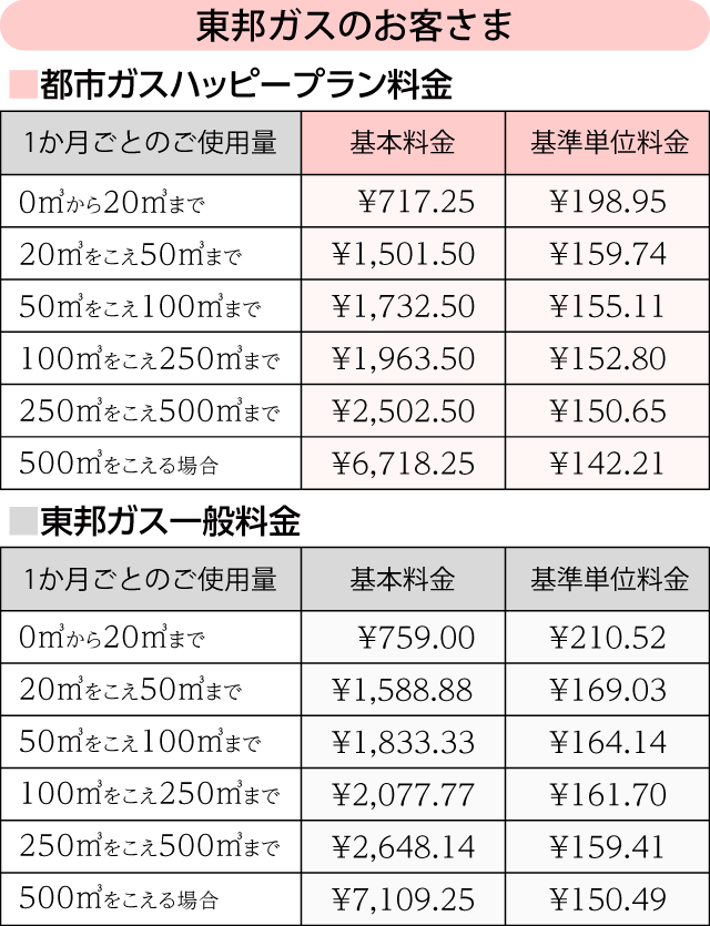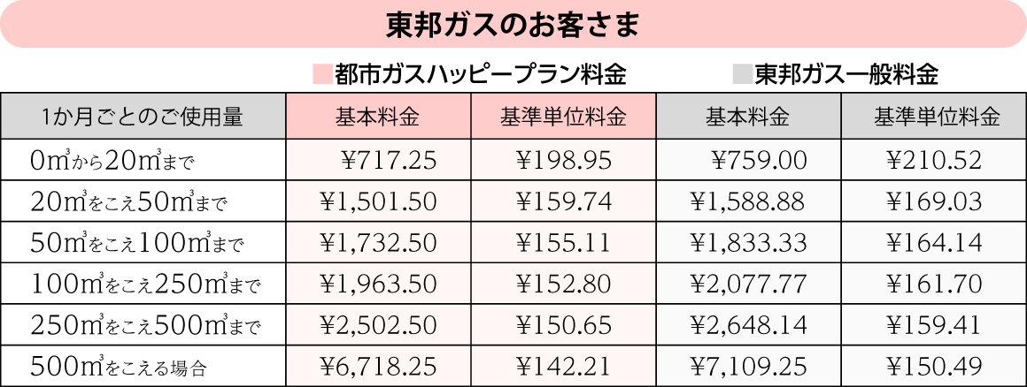 【東邦ガス】都市ガスハッピープラン料金表